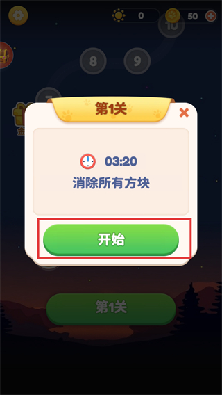 1、进入【第1关】的界面,目标是【消除所有方块】、限时【03:20】,点击绿色的【开始】按钮,开启该关卡的消除挑战。