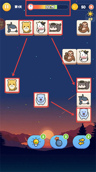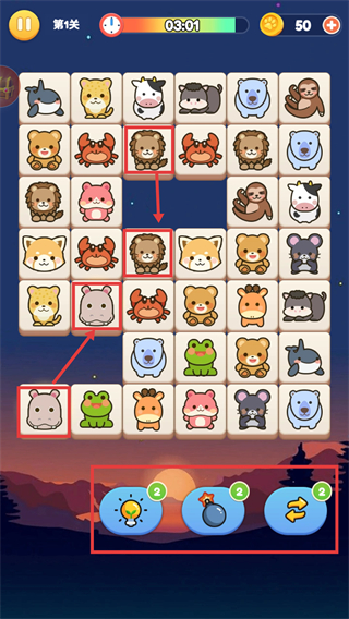 2、在【第1关】的游戏界面,跟随红色箭头匹配相同方块(如狮子、河马),借助底部道具辅助消除,推进关卡进度。