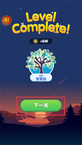 4、通关后出现【Level-Complete】提示,获得【+235】的智慧值,点击绿色的【下一关】按钮,进入后续消除关卡。