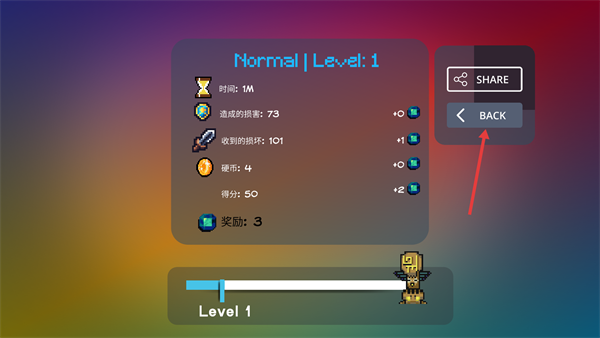 4、通关后查看结算界面,记录获得的【101】银币等奖励,点击【BACK】继续挑战。