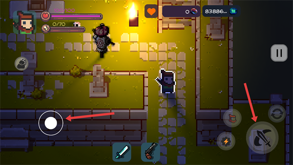 2、在场景中通过左侧移动键控制角色走位,右侧切换武器,探索地牢区域并与NPC交互。