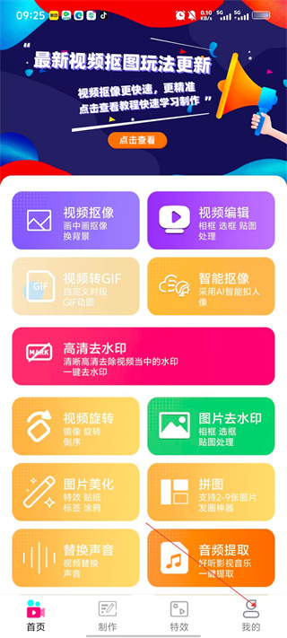 1、在应用首页,可使用视频抠像、编辑、去水印等功能,完成创作后点击底部“我的”进入个人中心。