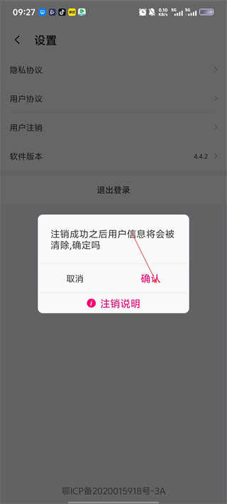 4、若确认注销,点击“确认”按钮即可完成账号注销;若放弃,点击“取消”返回设置页面。