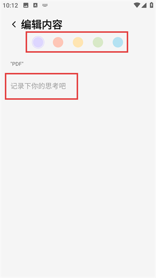 4、进入编辑内容页,选择高亮颜色,在输入框填写思考内容,完成对文献内容的标注与笔记记录。