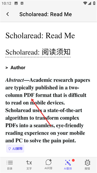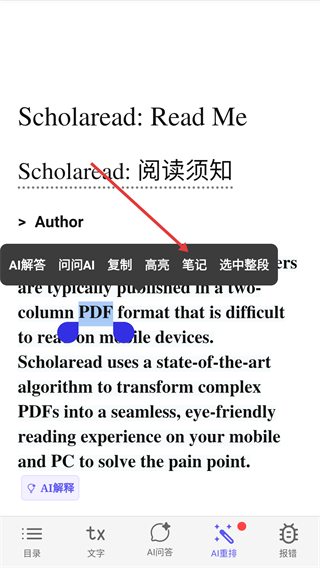 2、进入文献阅读页,可查看【Scholaread:阅读须知】及文献内容,底部功能栏支持阅读优化的操作。