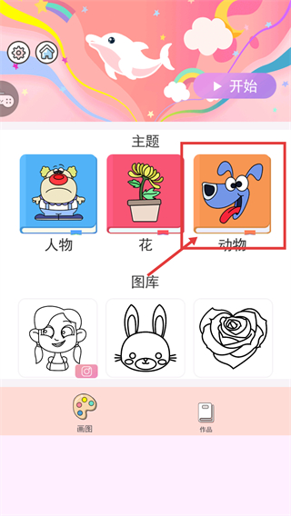 2、点击【开始】后,在【主题】分类里选择红框标注的【动物】选项,可进入动物主题的绘画素材图库界面,挑选对应创作素材。