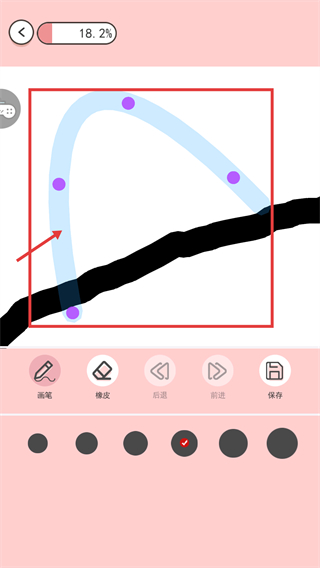 3、进入绘画环节后,看到进度【18.2%】,跟随红框内的绘画路径,用【画笔】工具按轨迹绘制,推进当前作品的绘画进度。