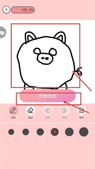 4、绘画线稿完成后进度达【100.0%】,点击红框标注的【开始涂色】按钮,即可进入该作品的涂色操作环节,开启色彩填充流程。
