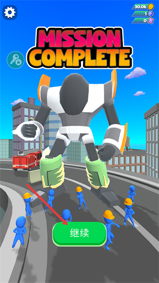 4、击败敌人后,点击【继续】回到游戏主界面,准备提升机甲战力。