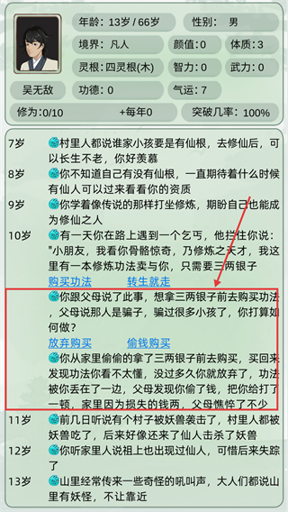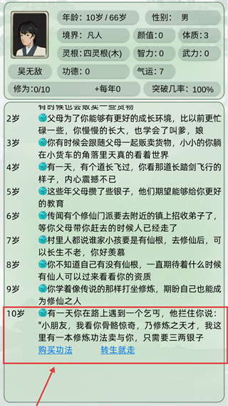 3、10岁遇到乞丐卖功法时,根据家庭资源选择【购买功法】或【转生就走】,不同选择会开启不同修仙起步路径。
