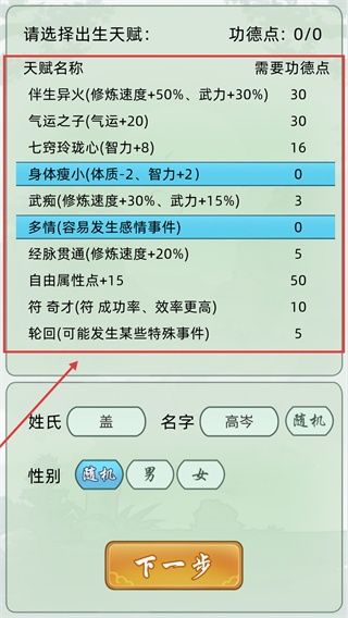 1、可选择【身体瘦小】-【多情】等天赋,设置姓氏名字性别,完成初始角色创建开启修仙。