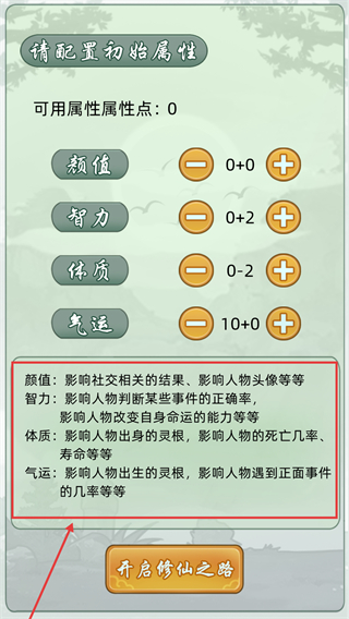 2、调整【颜值】-【智力】-【体质】-【气运】数值,确认属性后点击开启修仙之路。