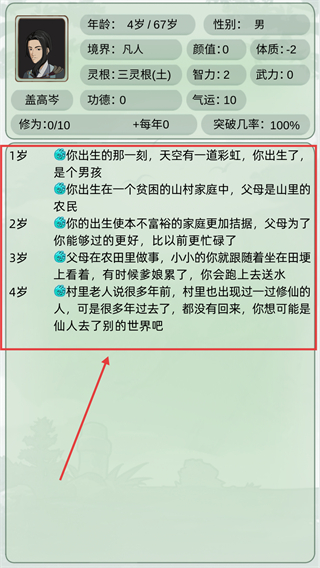 3、经历1到4岁事件,如出生贫困家庭、跟随父母劳作,积累早期修仙基础信息。