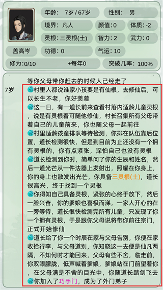 4、7岁时参与灵根检测,获得【三灵根(土)】后加入【巧手门】,开启正式修仙旅程。