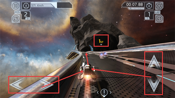 2、太空赛道竞速时,留意【1GT】的提示信息,跟随赛道箭头操控载具,当前【POS-2】需提升速度来追赶前方对手。