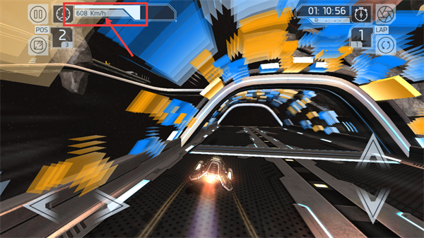 3、赛程中关注【608-Km/h】的速度变化,沿隧道赛道的方向稳定操控载具,维持当前节奏以争取提升排位。