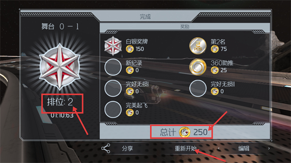 4、完成【舞台0-1】的竞速后,结算界面显示【排位:2】,可获取【总计-250】的奖励与白银奖牌,还能选择重新开始挑战。