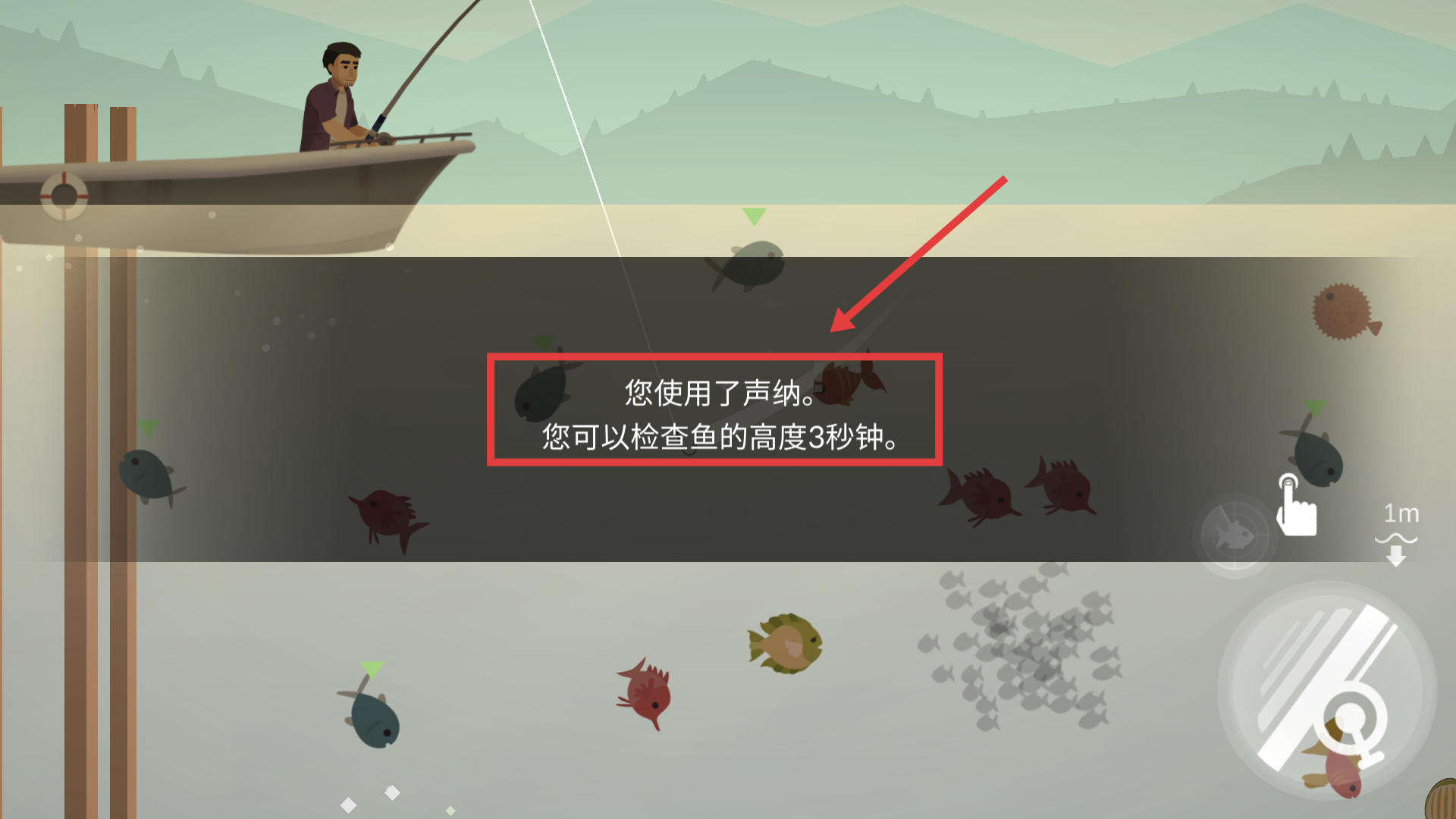 1、使用【声纳】功能,可检查鱼的高度【3】秒,精准定位鱼群,提升上钩成功率,助力高效钓鱼。