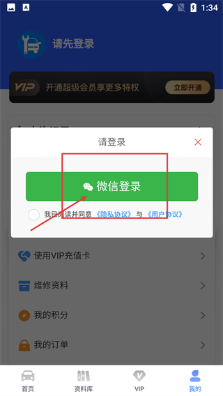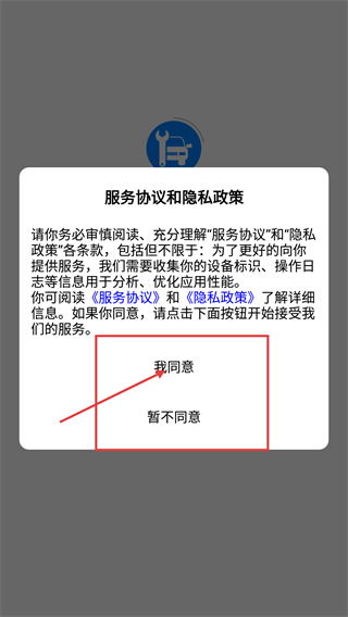 1、进入应用时,在“服务协议和隐私政策”弹窗中,阅读相关条款后点击【我同意】按钮,进入汽车维修宝主界面。