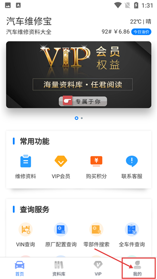 2、在汽车维修宝首页(含常用功能、查询服务等板块),点击底部导航栏的【我的】选项,进入个人中心页面。