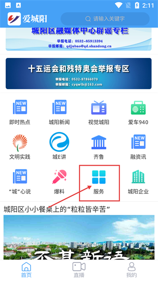 1、进入爱城阳APP首页(含即时热点、城阳新闻等功能模块),点击【服务】选项,进入便民服务页面。