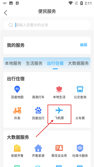 2、在便民服务页面,切换至“出行住宿”标签栏,找到【飞机票】选项并点击,进入机票查询操作界面。