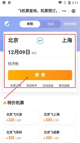 3、在机票查询页面,选择行程类型(单程/往返),填写出发地、目的地、出行日期,选定舱位后,点击【搜索】按钮。