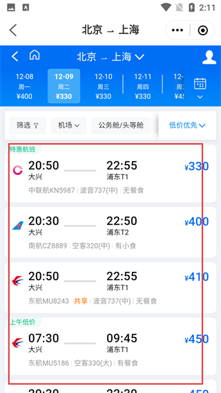 4、搜索完成后,即可查看对应日期的航班信息,包括起降时刻、机场、航空公司、机型及票价等内容。