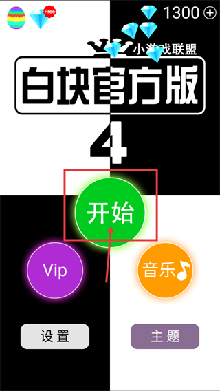 1、进入【白块官方版】界面,看到【1300】钻石标识,点击红框标注的【开始】按钮,进入该白块类游戏的游玩环节。