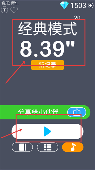 4、结束后看到【经典模式-8.39"】的【新纪录】提示,点击红框内的播放按钮,重新开启一局游戏挑战。