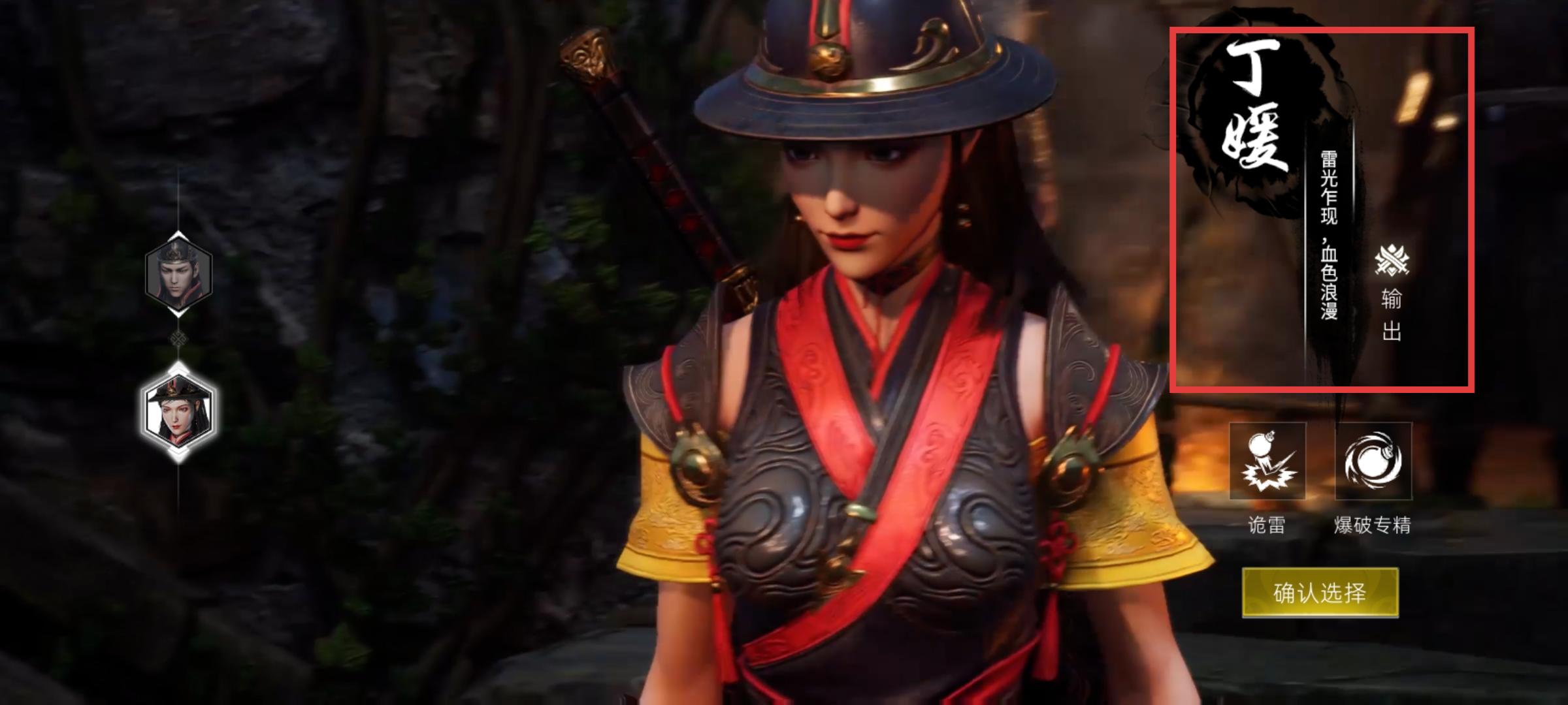 1、选择【丁暖】角色,了解其【雷光乍现,血色浪漫】的输出特性,点击确认开启武侠竞技之旅。
