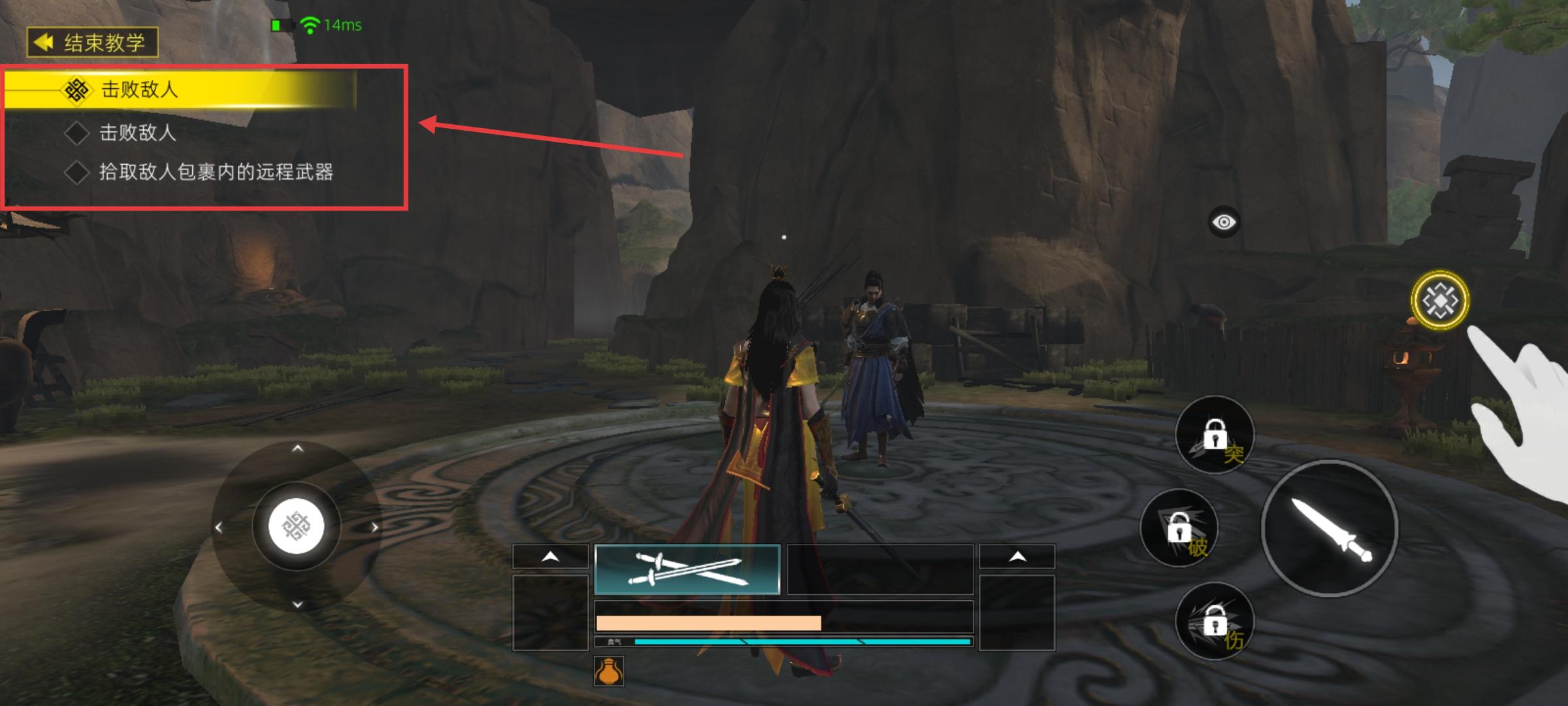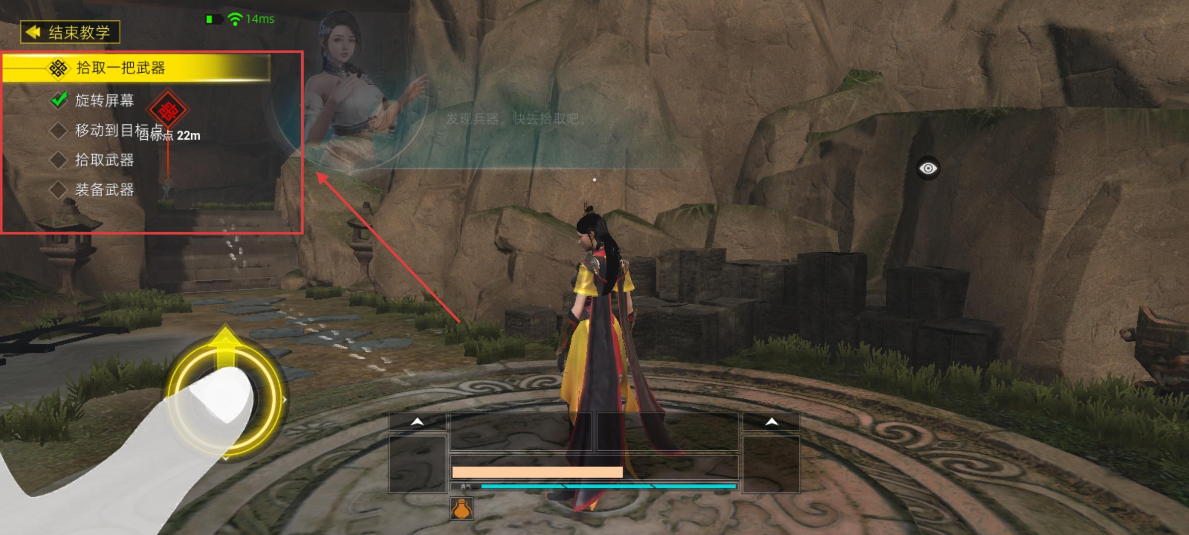 2、按指引旋转屏幕,移动到目标点,拾取并装备武器,完成基础操作的教学步骤。