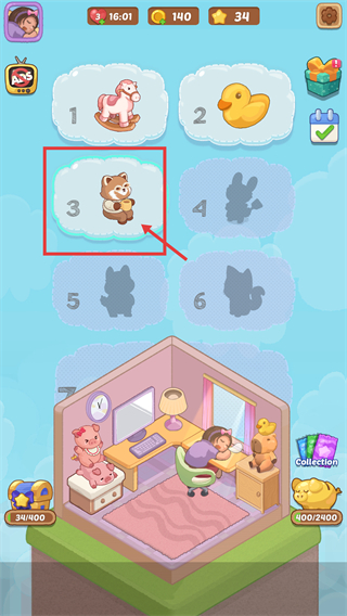 1、选择【3-小浣熊】对应的收集目标,查看当前爱心、金币、星星,进入房间场景准备推进布置任务。