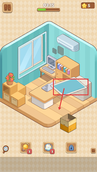 3、剩余【03:15】时间时,互动标注的床垫,利用底部道具完成场景布置,当前星星已积累至【5】。
