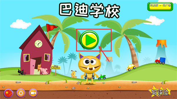1、进入【巴迪学校】界面,点击红框标注的绿色播放按钮,即可进入游戏的互动环节,开启后续的趣味挑战内容。