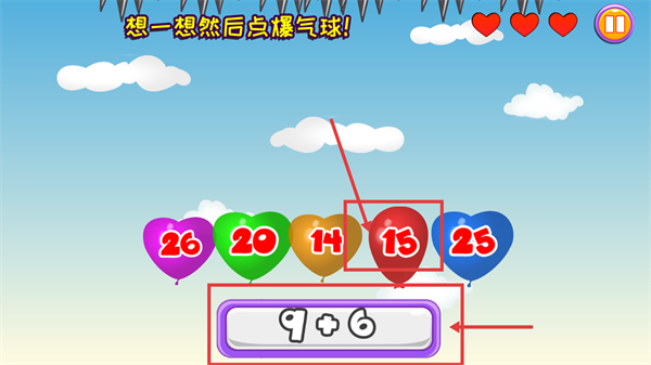 2、看到【想一想然后点爆气球!】提示,计算底部【9+6】的结果为15,点击红框内标有15的气球,完成该步骤操作。