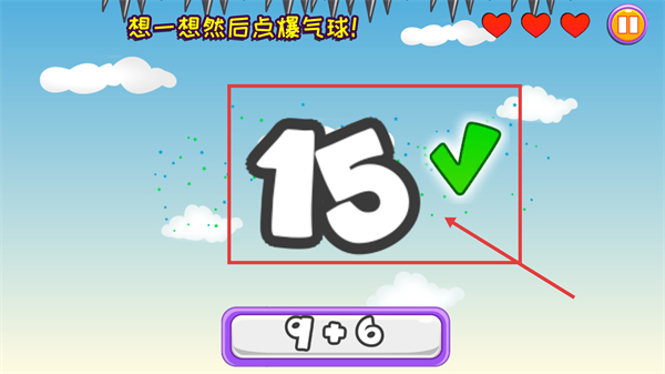3、点中对应气球后,红框内显示【15】及对勾标识,确认该次计算操作正确,可等待下一个计算任务推进游戏。
