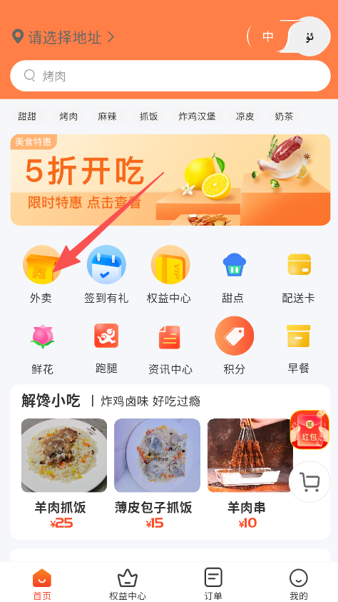 2、点击外卖板块,查看抓饭、民族餐等美食分类。