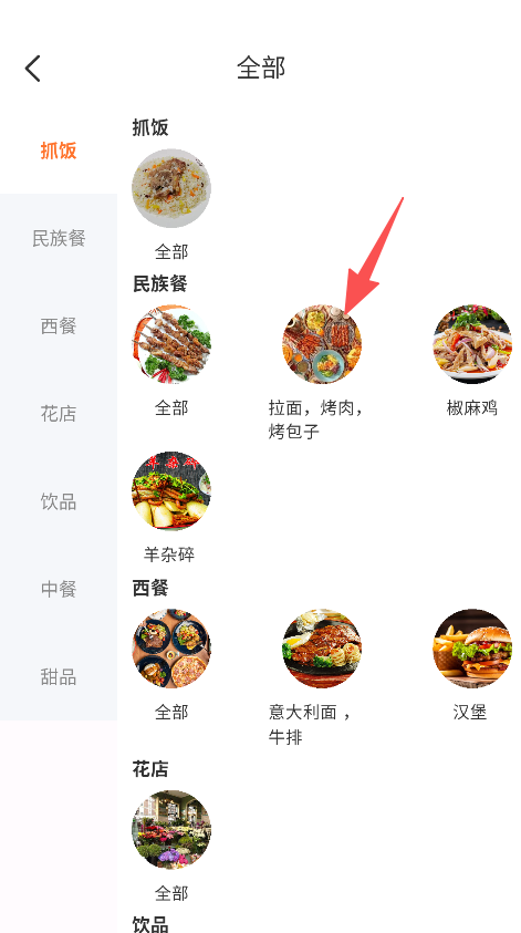2、支持美食分类浏览功能,查看抓饭、民族餐等细分类别,找到对应类别的餐饮商家。