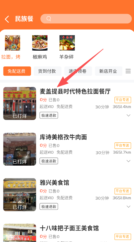 3、选择民族餐分类,查看对应商家的信息内容。