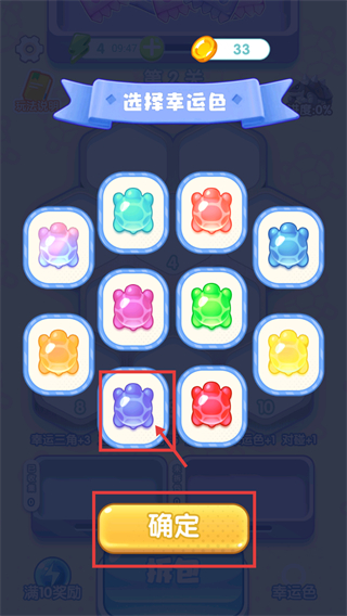 2、进入【选择幸运色】界面后,选定目标乌龟图标(如紫色款),点击【确定】按钮,完成幸运色选择以继续关卡流程。
