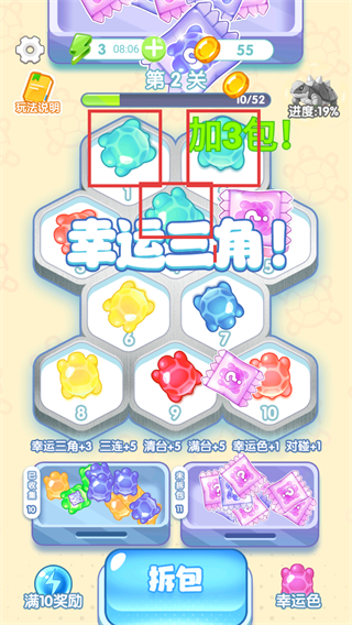 3、在【第2关】中达成【幸运三角!】消除,触发【加3包!】奖励,同时提升【进度-19%】,还能获取多类积分收益。