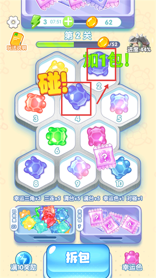 4、在【第2关】中完成【碰!】消除组合,触发【加1包!】奖励,推进【进度-44%】,同时累计【已收集-23】的道具数量。