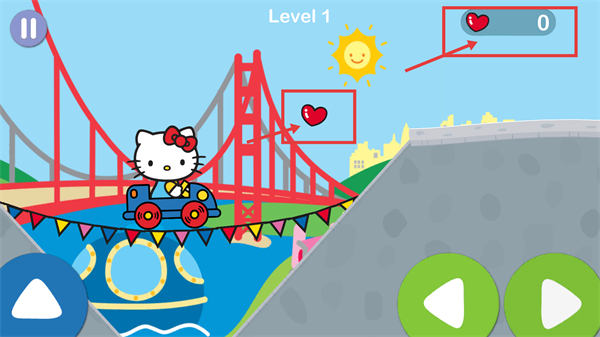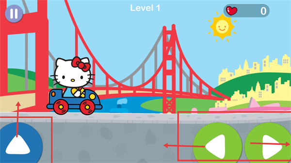 2、进入【Level-1】关卡,用标注的控制按钮操控Hello Kitty的车辆移动,留意心形进度【0】,逐步推进赛车的行驶路径。