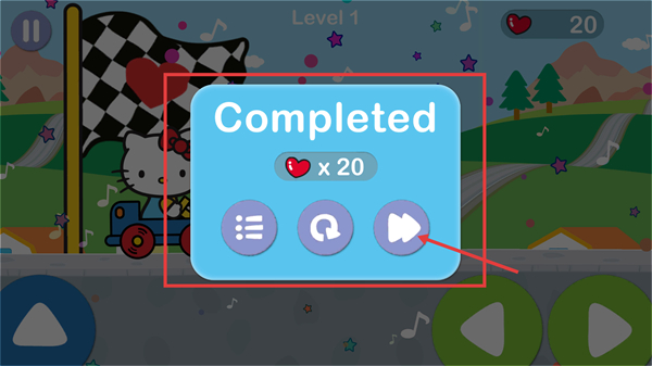 4、通关【Level-1】后显示【Completed】提示,获得【20】心形,点击标注的箭头按钮,进入后续赛车关卡。
