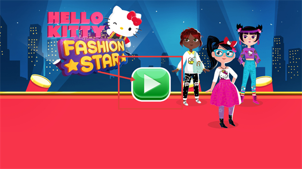 1、界面显示【Hello-Kitty-Fashion-Star】标识,点击标注的绿色播放按钮进入游戏,开启时尚装扮的关卡玩法,推进游戏流程。