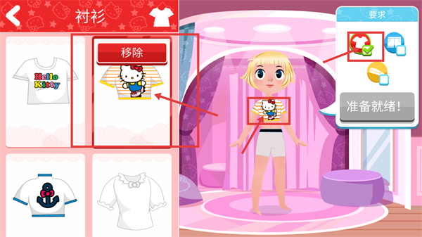 2、进入【衬衫】装扮界面,选择标注的【Hello-Kitty】款式为角色装扮,匹配右侧的装扮要求,推进时尚搭配流程。