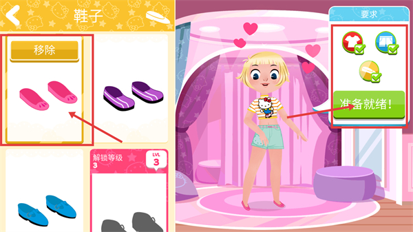 3、切换到【鞋子】分类,选择标注的粉色鞋子完成搭配,右侧要求达成后点击【准备就绪!】,完成本次装扮环节。