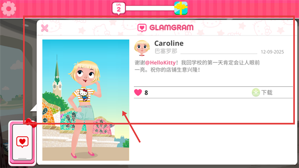 4、装扮完成后进入【GlamGram】界面,查看角色的分享内容与【8】个点赞互动,完成本次时尚装扮的展示流程。