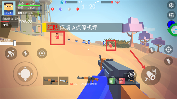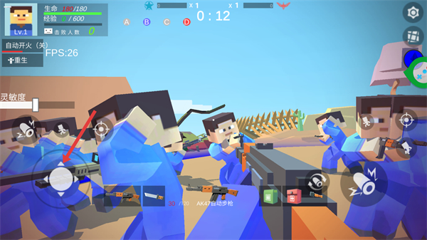 2、进入战斗界面后,通过左侧移动键控制角色移动,点击右侧开火按钮进行射击,同时可切换武器参与战斗。